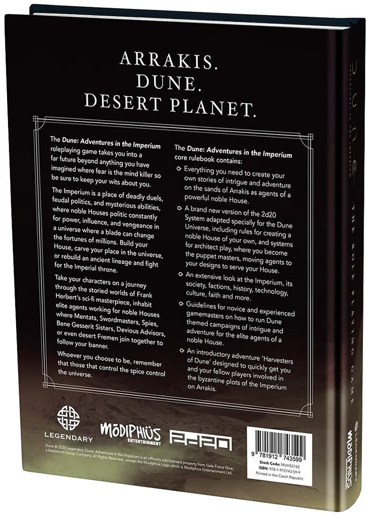 The Dune: Adventures in the Imperium roleplaying game takes you into a far future beyond anything you have imagined, where fear is the mind killer so be sure to keep your wits about you. The Imperium is a place of deadly duels, feudal politics, and mysterious abilities, noble Houses politic constantly for power, influence, and vengeance in a universe where a blade can change the fortunes of millions. Build your House, carve your place in the universe or rebuild an ancient lineage and fight for the Imperial throne.