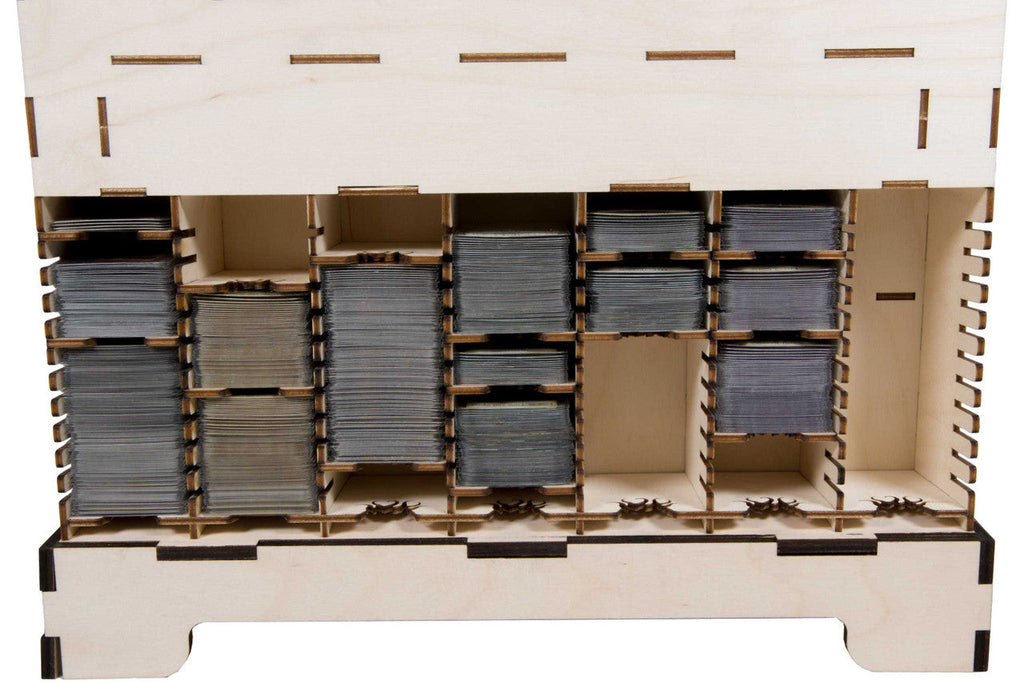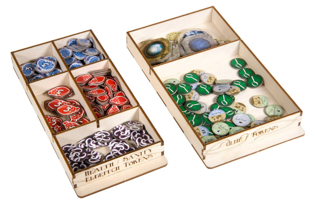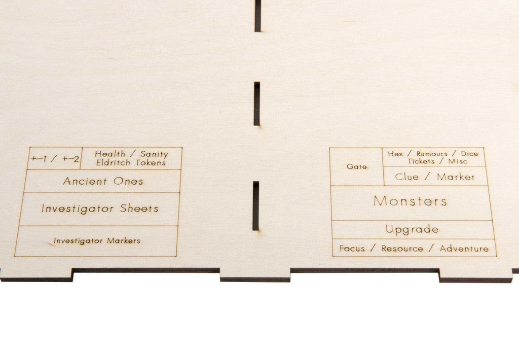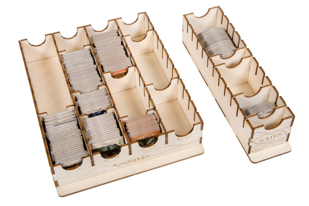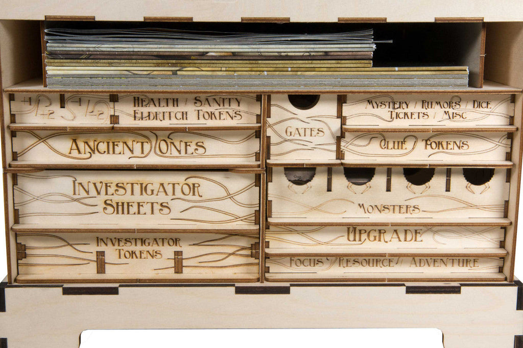 Staying one step ahead of these otherworldly forces can be draining with all of the materials you've collected to thwart the Ancient One's plot. Now it's time to collect yourself, get organized, and start turning the tables with our Eldritch Horror Game Crate compatible with Eldritch Horror from Fantasy Flight Games. This crate is designed to store all of your tokens, markers, cards, and more within a premium wooden crate engraved with thematic art. Includes 20 large card section dividers and 14 small card section dividers.