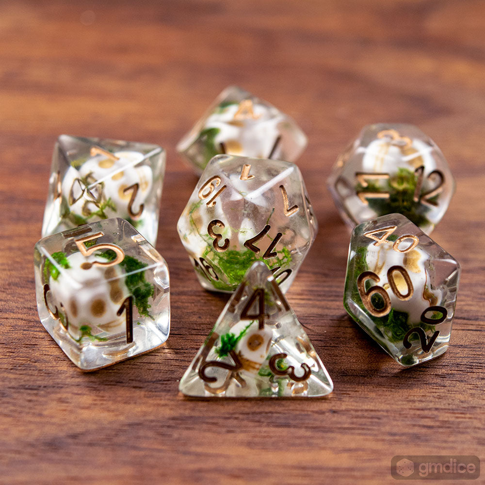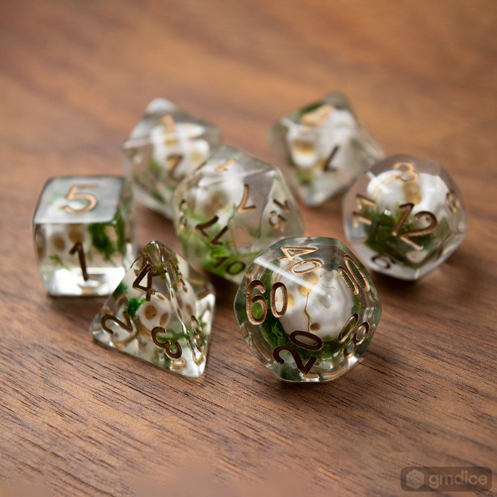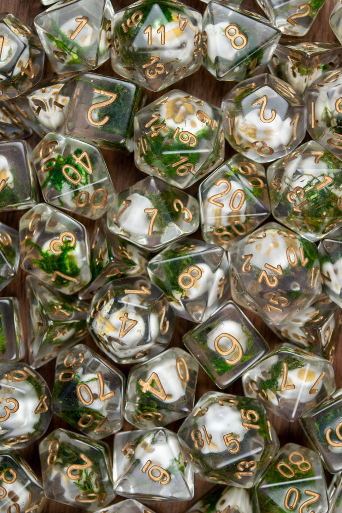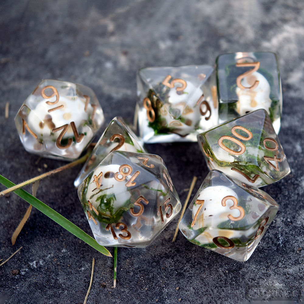Encased in clear resin, these dice include white skull beads and moss, reminiscent of a graveyard.