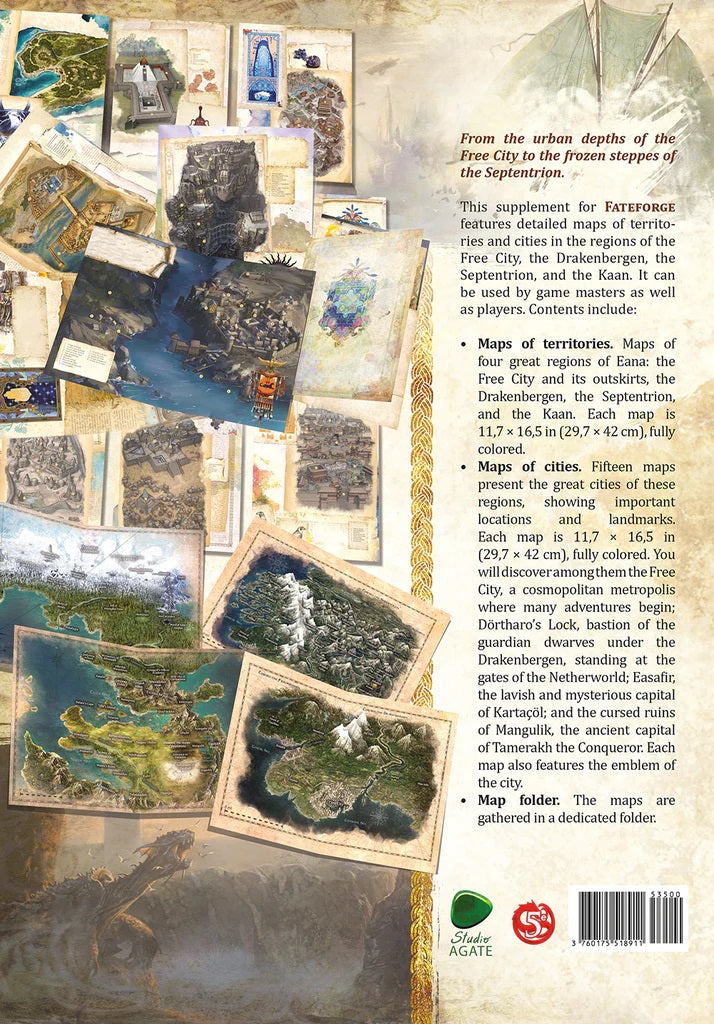 This supplement for Fateforge features detailed maps of territories and cities in the regions of the Free City, the Drakenbergen, the Septentrion, and the Kaan. It can be used by game masters as well as players. Contents include: