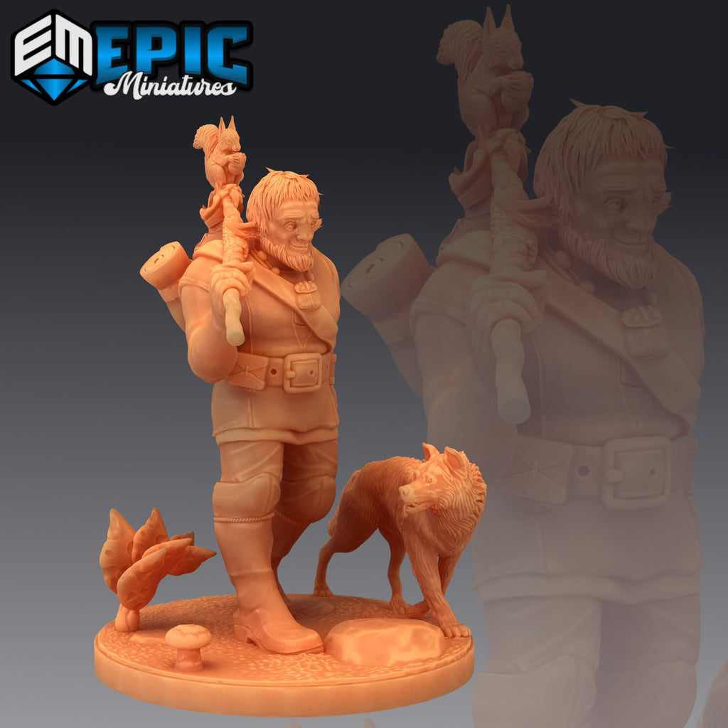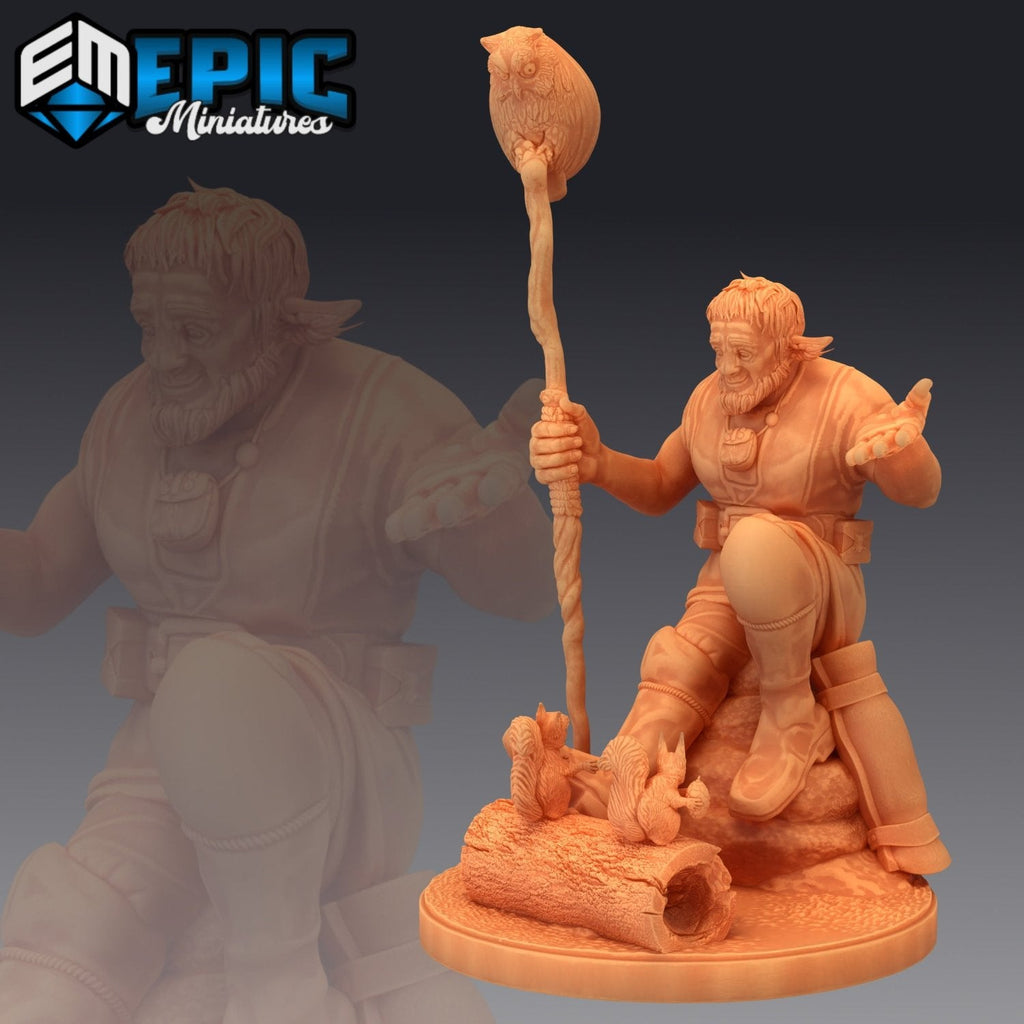 A Firbolg Druid depicted in various stances: interacting with woodland creatures, accompanied by a wolf, and wielding a staff topped with an owl. Perfect for D&D and other fantasy tabletop RPGs. Embrace the magic of nature, and don't worry—this Firbolg won't "leaf" you behind!