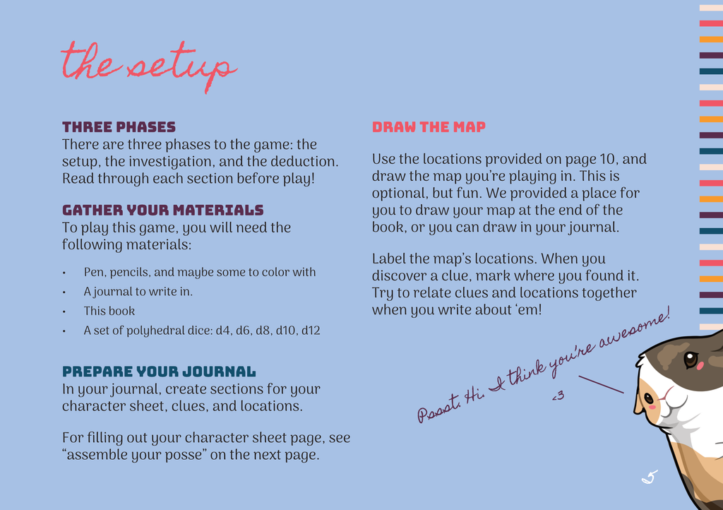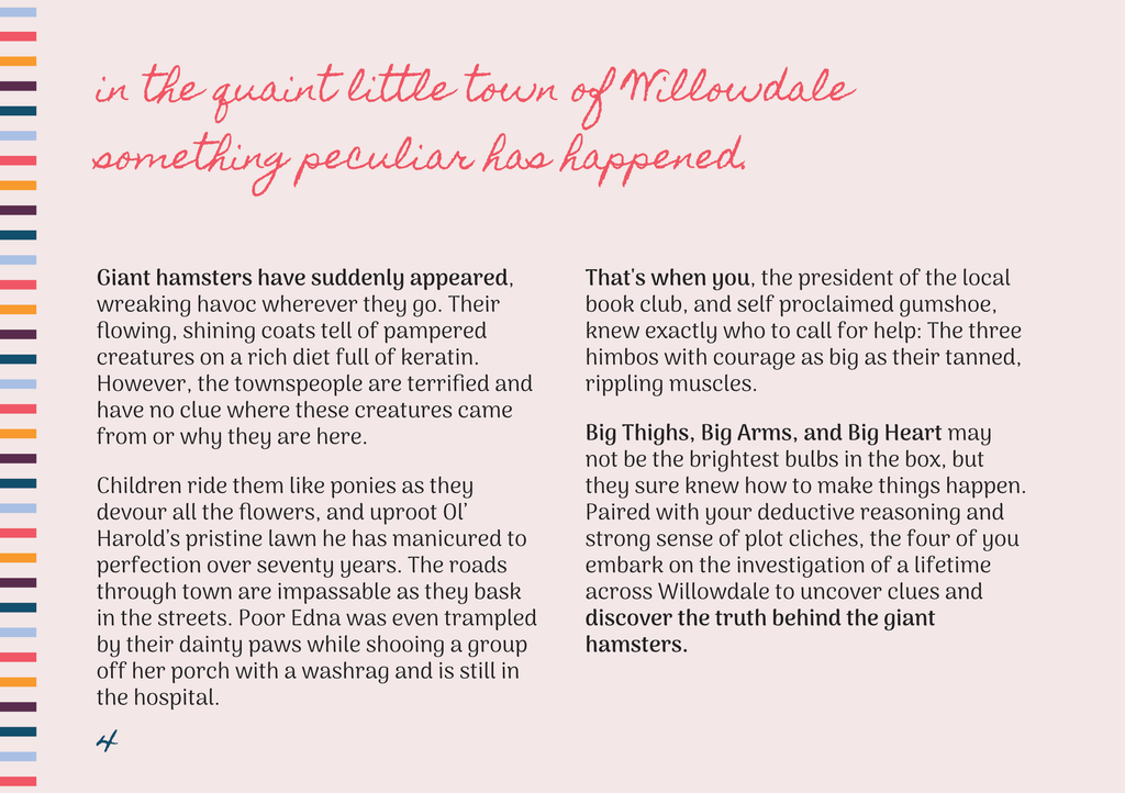 Get ready for a hilarious solo adventure in "Hamsters and Himbos"! As the president of the local book club and self-proclaimed gumshoe, you'll team up with three lovable himbos to solve the mystery of giant hamsters taking over Willowdale. Roll dice, gather clues, and use your deductive skills to uncover the truth behind this furry invasion. With 20 colorful pages of prompts and locations, this A5 zine game combines journaling, dice rolling, and laugh-out-loud scenarios for a uniquely entertaining experience. Perfect for mystery lovers and solo gamers looking for a whimsical challenge!