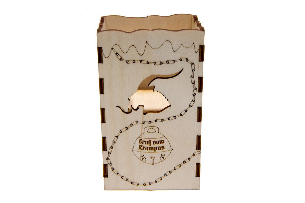 Roll with seasonal cheer with this Krampus themed mini dice tower, complete with custom engravings. Tower folds for easy travel and looks great in the middle of any gaming table. This tower ships as a kit that you easily snap together in minute, no glue required!