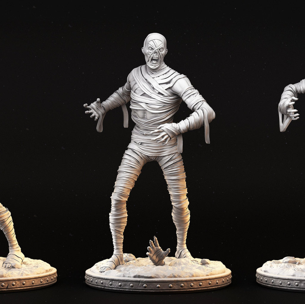3D-printed Mummy miniature for tabletop RPGs like D&D and Pathfinder. Depicted in a classic pose with tattered bandages, perfect for adding an undead menace to your campaigns. Ideal for RPG enthusiasts looking for detailed, paintable models to enhance their horror-themed adventures.