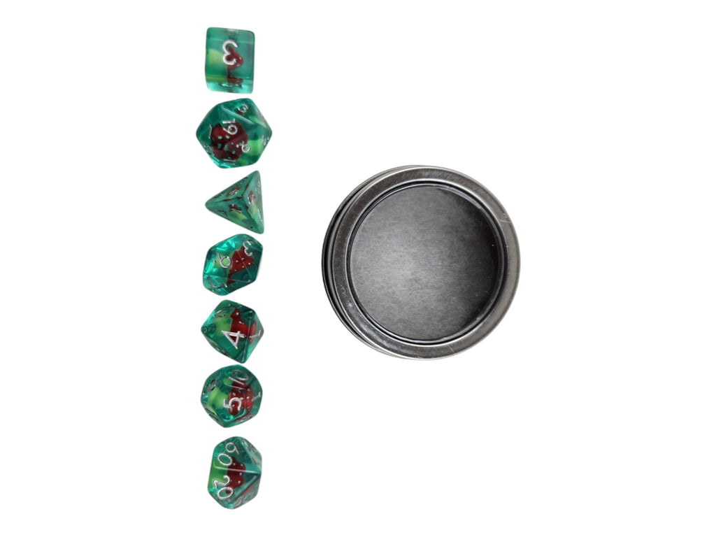 Set of Mushroom dice. Transparent teal dice with a plastic mushroom in each dice.
