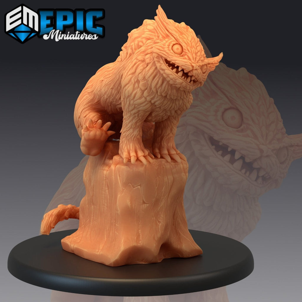 The Owlcat, a whimsical creature inspired by the ferocity of an owlbear but with a feline twist, is here to bring both terror and adorable curiosity to your tabletop games. With various poses capturing its playful and watchful nature, this miniature is purr-fect for your next adventure. Whether it's perched on a rock or standing upright, the Owlcat is ready for action.