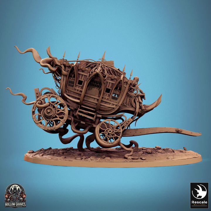 The Phantom Coach is a haunted carriage reminiscent of a ghostly ride, adorned with twisted vines and eerie figures. This intricate prop is perfect for TTRPG campaigns like Dungeons & Dragons and Pathfinder, adding a spooky element for adventurers. An ideal centerpiece for tabletop or miniature displays.