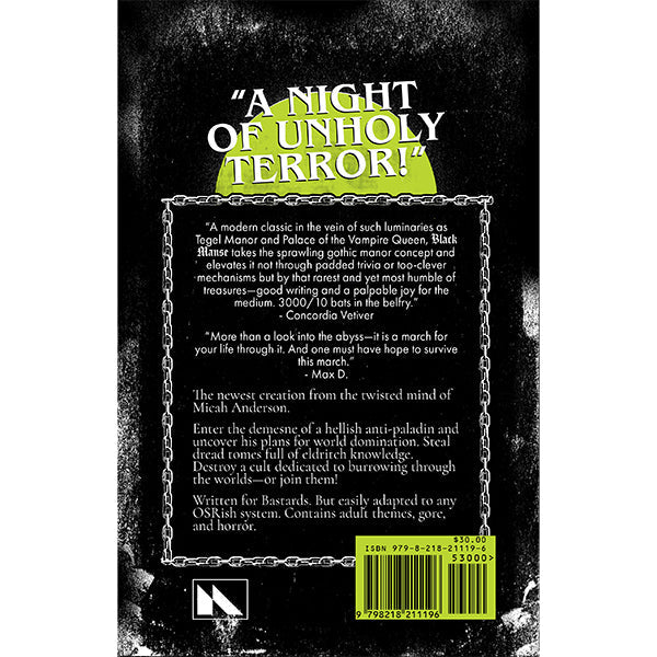 The newest creation from the twisted mind of Micah Anderson! Enter the demesne of a hellish anti-paladin and uncover his plans for world domination. Steal dread tomes full of eldritch knowledge. Destroy a cult dedicated to burrowing through the worlds—or join them! The Black Manse is a gothic horror adventure in the classic style, written for any fantastic roleplaying game of your choosing. Experience a night of unholy terror!