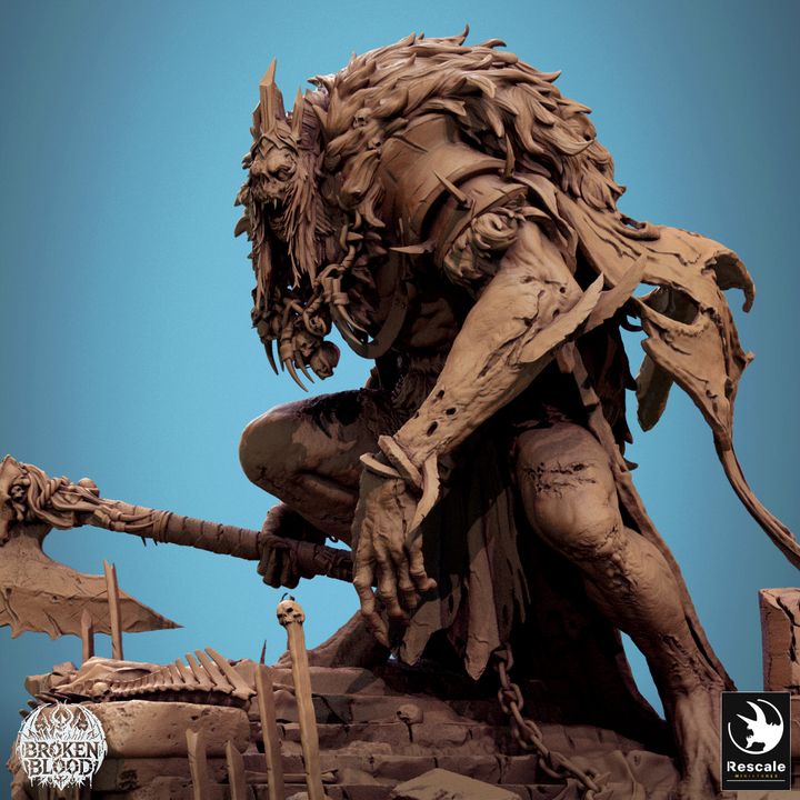 The Undead King miniature stands as a terrifying symbol of death and decay, wielding a massive, jagged axe and draped in tattered robes adorned with skeletal remains. Perfect proxy for Ushoran, this highly detailed figure brings an ominous presence to any tabletop scene or display collection.