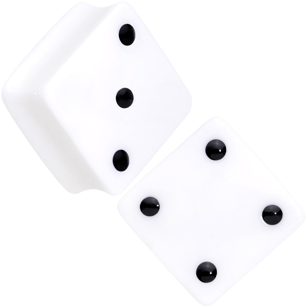 Roll the dice for lucky number 7. These square shaped saddle plugs feature a double-sided design with a pair of dice, one with the number three and one with the number four on each side. These lightweight white acrylic plugs feature a double flare design. Sold as a set of two. NOTE: Prices of plugs may vary based on plug ear gauge size selected from drop down. Specifications
