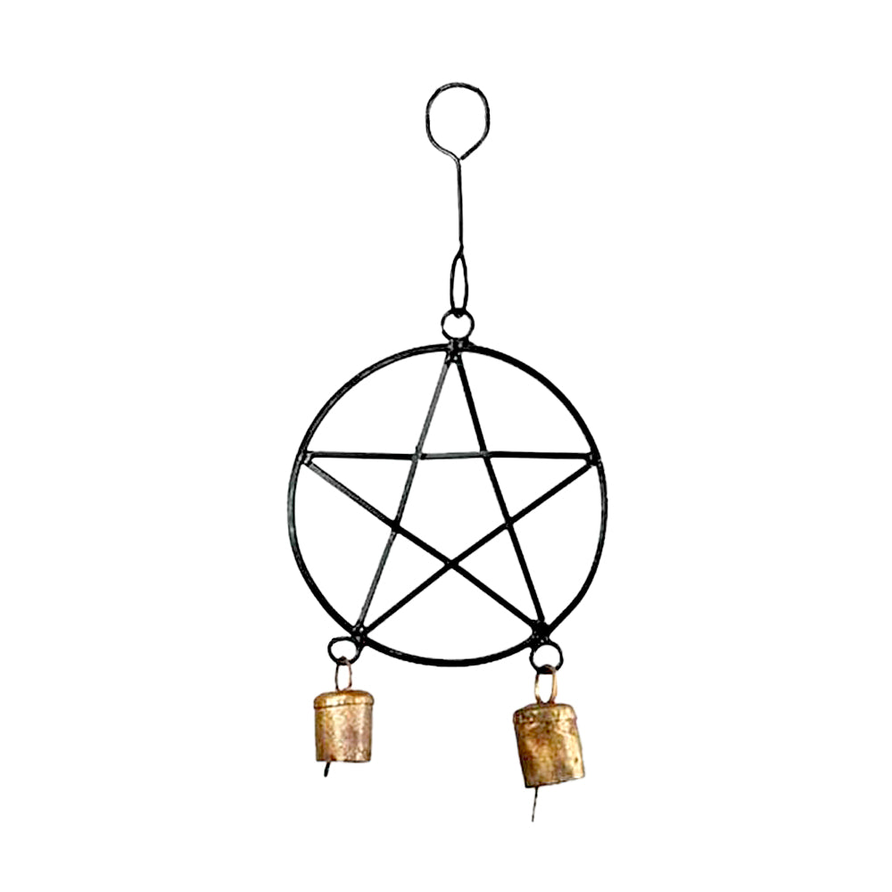 Black Metal Pentagram Pentacle Wind Chime with Tin Bells. 11" with bells and hook.
