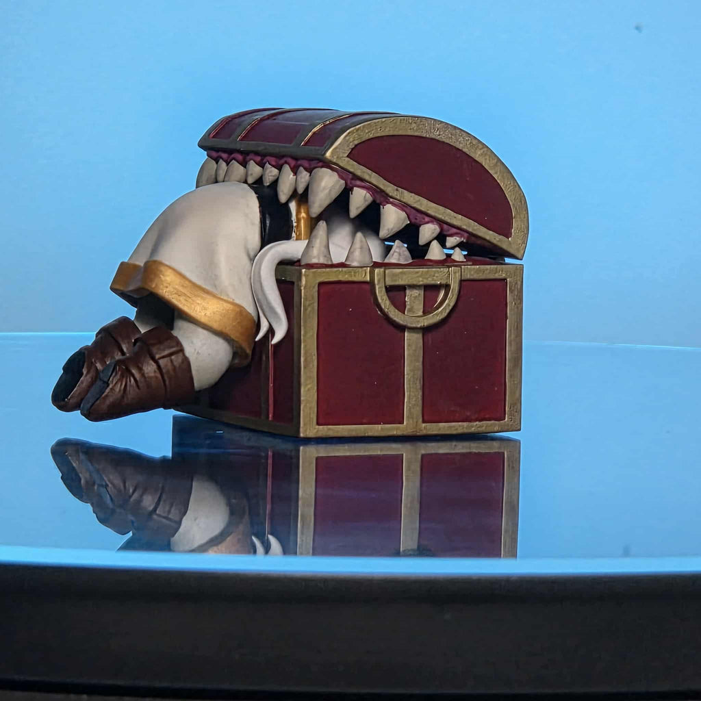 Chibi Frieren from Frieren: Beyond Journey’s End depicted in an adorable stylized figure. Includes swappable poses—standing with staff and lantern, or hilariously devoured by a mimic chest. Displayed on a flowered stone base, this figure captures charm and misadventure.
