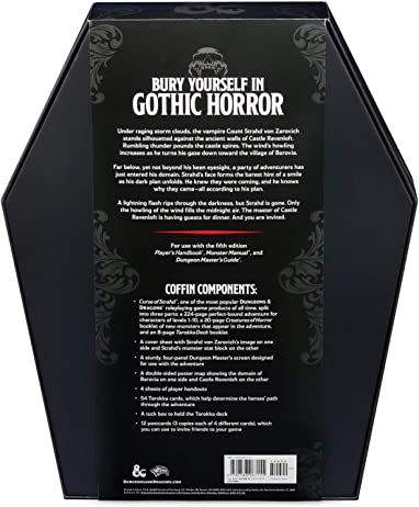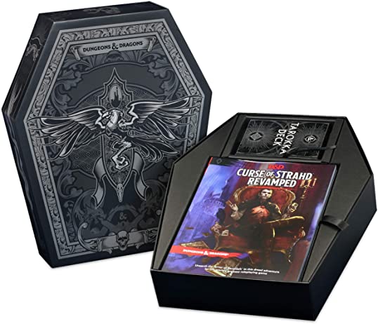 Curse of Strahd, one of the most popular Dungeons & Dragons roleplaying game products of all time, split into three parts: a 224-page perfect-bound adventure for characters of levels 1–10, a 20-page Creatures of Horror booklet of new monsters that appear in the adventure, and an 8-page Tarokka Deck booklet.