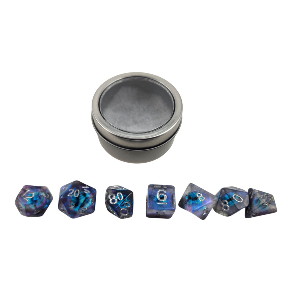 Set of Dragon Eye dice. Clear/blue and purple dice. A blue/ purple and light teal dragon eye in each dice.