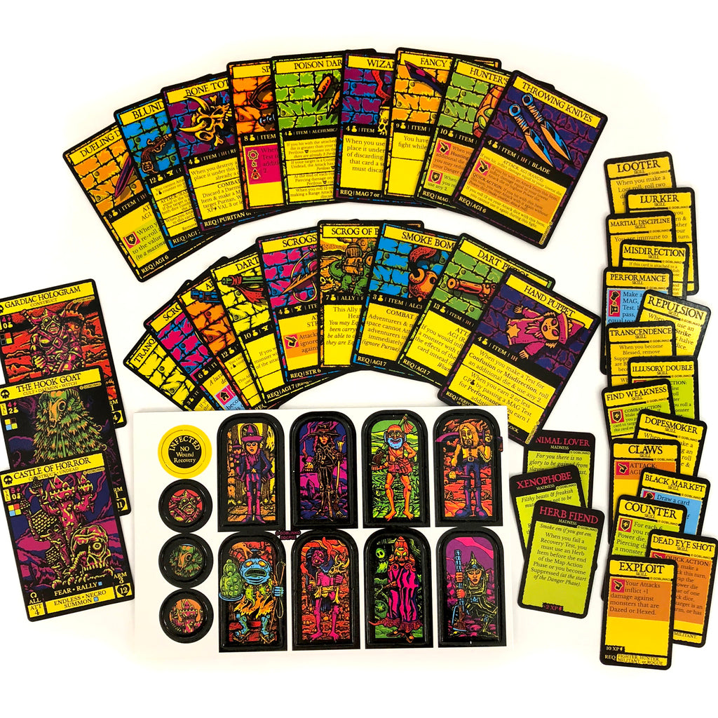 The Dungeon Degenerates Freaks & Psychos Expansion includes - 8 New adventurers with character sheets & standees. 18 Loot Cards. 15 Skill Cards. 3 Epic Monster Counters. 3 Epic Monster Cards. 1 Infected Counter. 3 Weakness Cards.