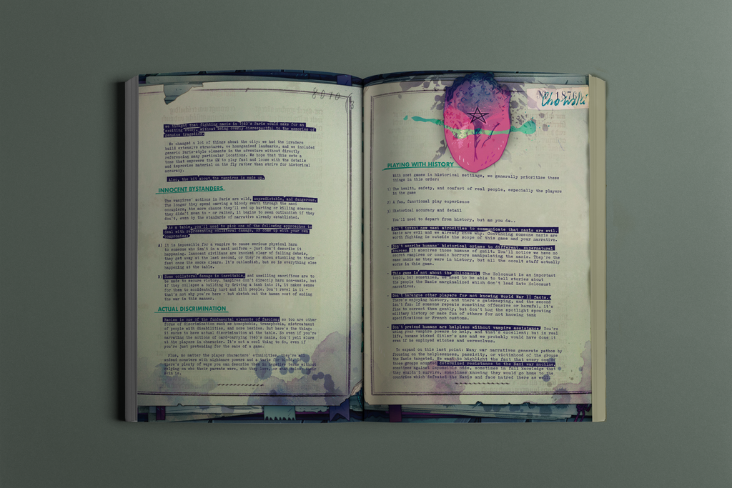 EAT THE REICH is a tabletop roleplaying game in which you, a vampire commando, are coffin-dropped into occupied Paris and must cut a bloody swathe through nazi forces en-route to your ultimate goal: drinking all of Adolf Hitler's blood.