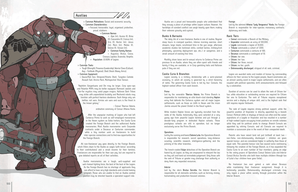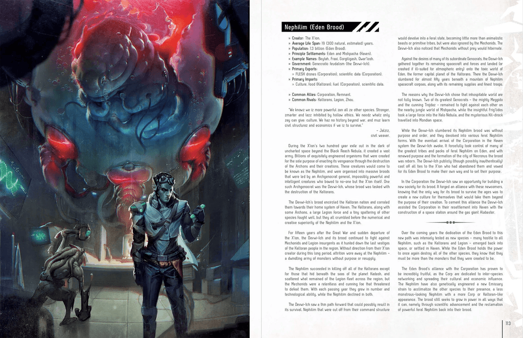 - Deep dives into the lore of the eight core playable species: the Corporation (Vargarti), Kaltoran, Legion, Nephilim, Palantor, Remnant (Ursai), Twi-Far and Zhou.