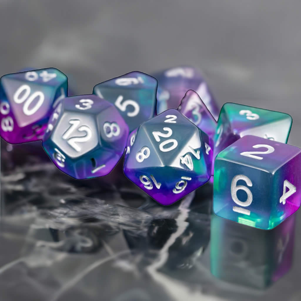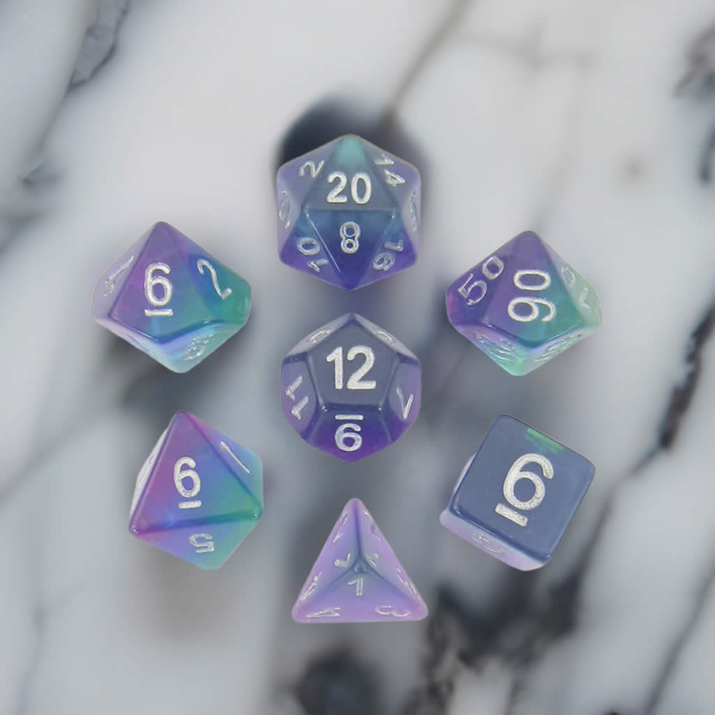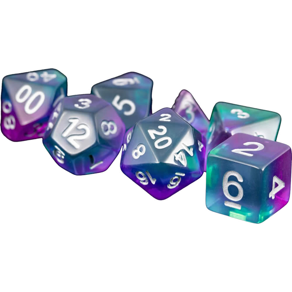 MET627 Blue Aurora with White Numbers Acrylic 16mm (5/8in) RPG 7 Dice Set Metallic Dice Games