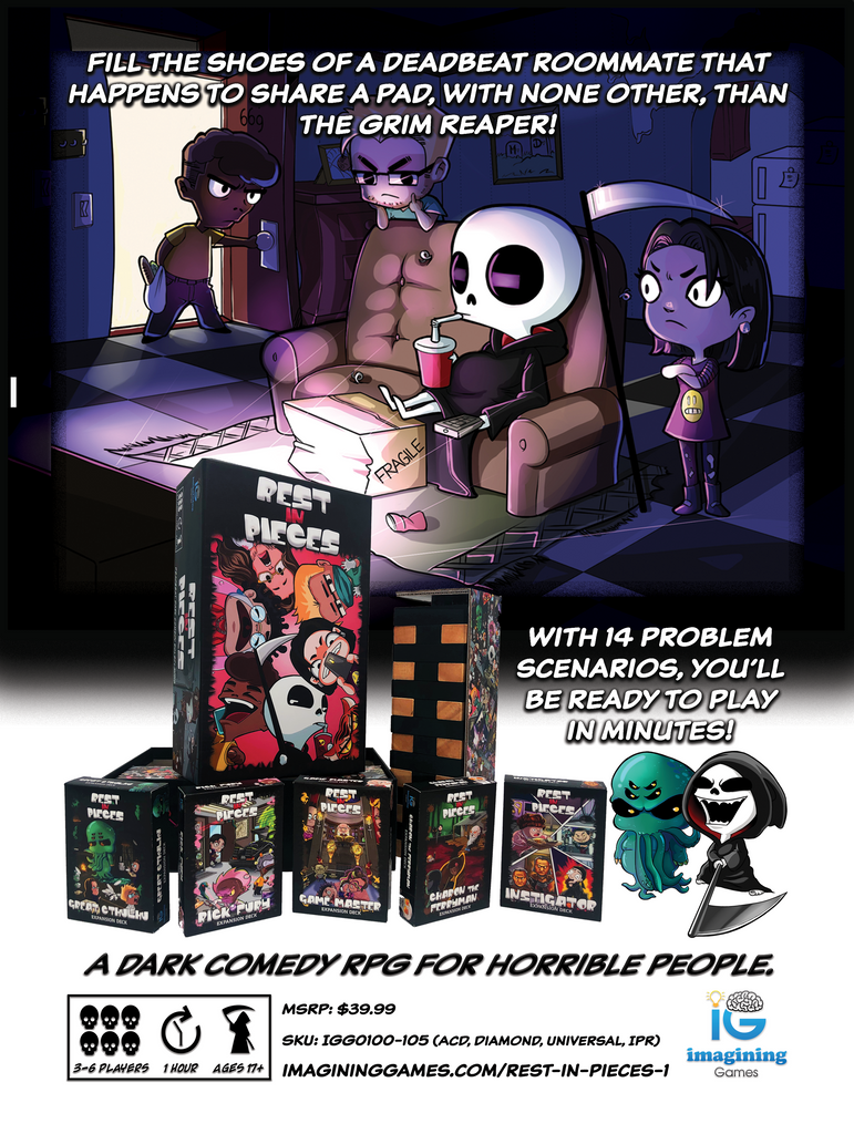 Rest in Pieces is a dark comedy tabletop roleplaying game inspired by the misadventures, cartoon logic, and over-the-top characters of slacker sitcoms like The Grim Adventures of Billy & Mandy, The Regular Show, Rick & Morty, and It’s Always Sunny in Philadelphia.