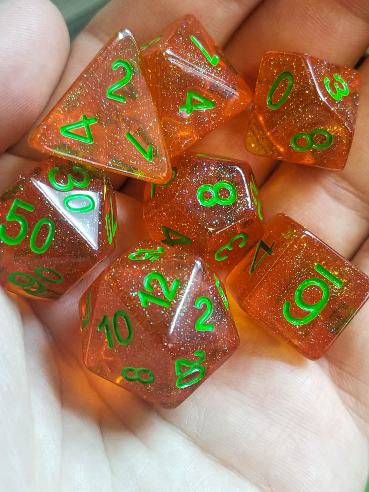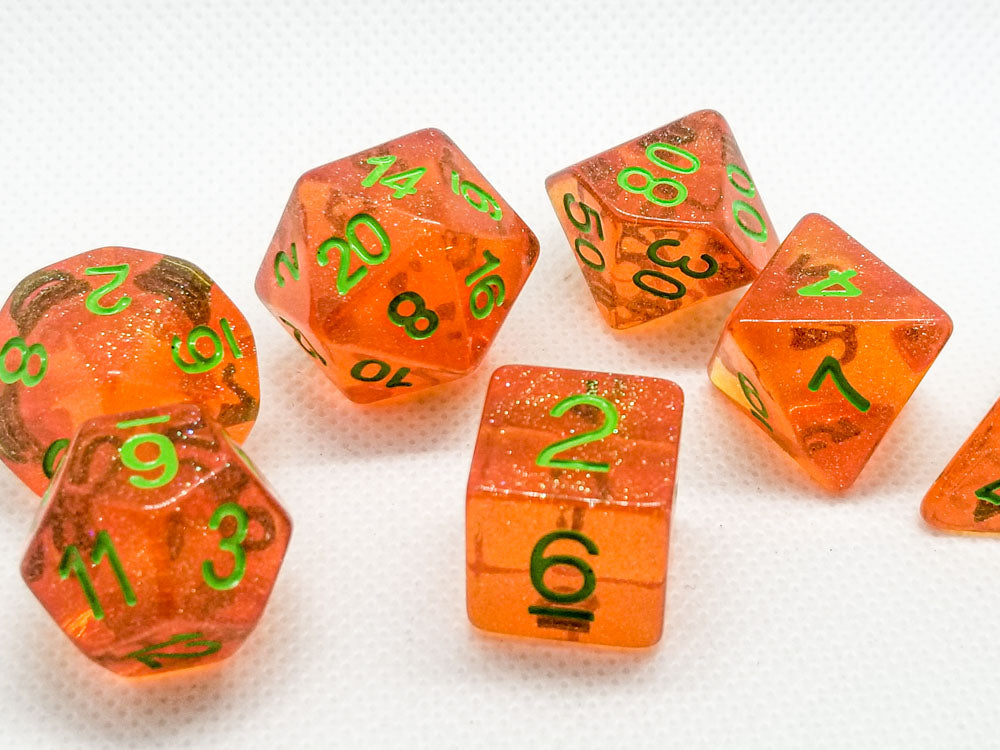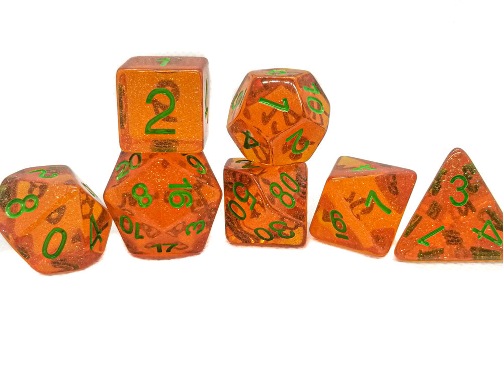 Time Walker | Orange w/Green Glitter 7-Dice Set RPG Dice Set