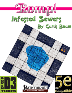 Romp! Adventure Tiles. This package contains random encounter tables for both Pathfinder and 5th Edition. It also has 18 - 6? x 6? maps, all 3D rendered and interchangeable, and complete room descriptions. These are included with printed 1? lines for use on your gaming table, and without lines as separate PNG files for use on virtual table top (VTT) gaming