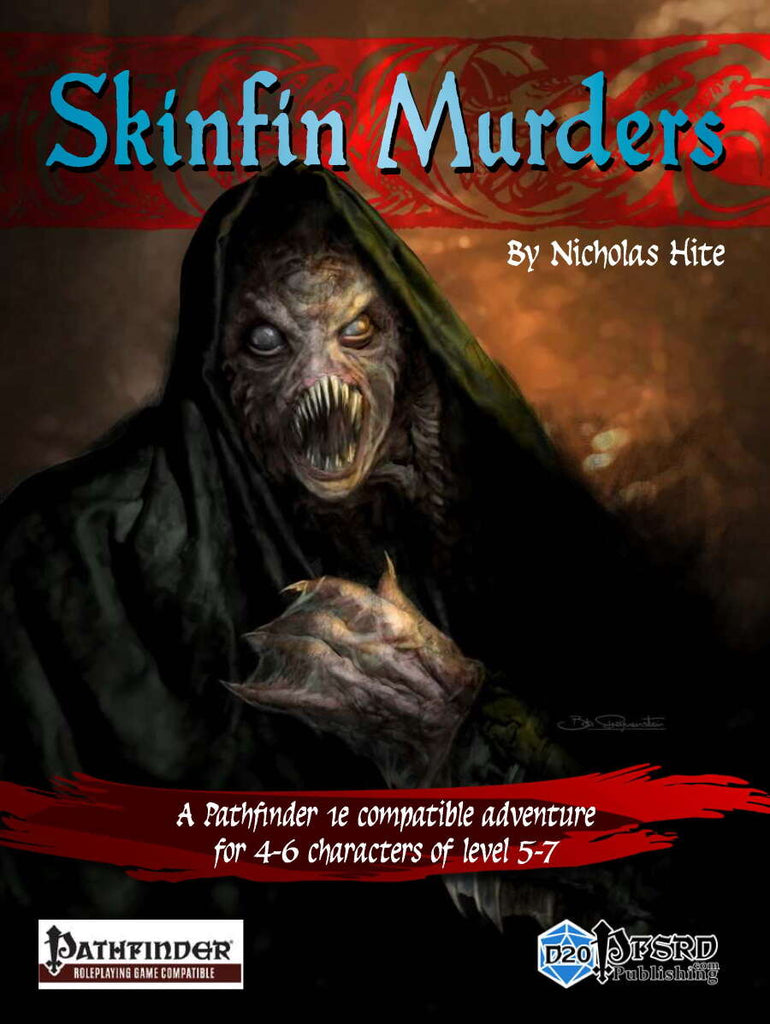 Skinfin Murders is a Pathfinder Roleplaying Game 1e compatible adventure for 4-6 5-7th level PCs.