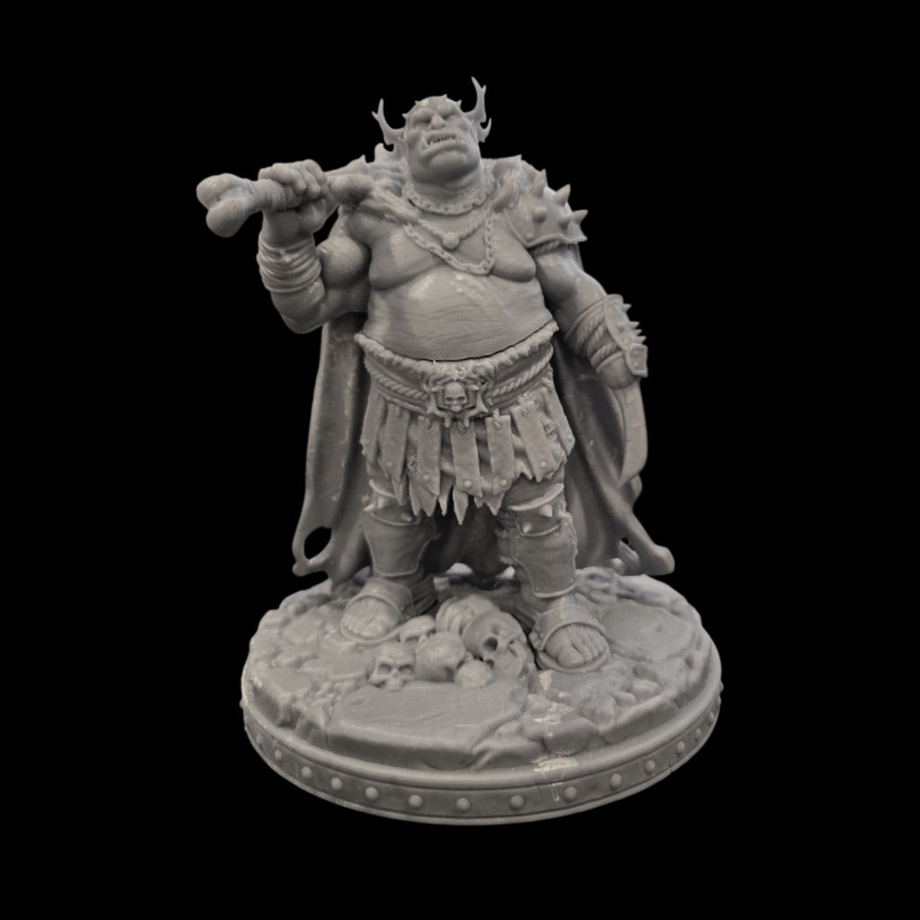 Gundahar, the imposing ogre lord, stands triumphantly with a massive spiked club resting on his shoulder. His heavy armor, skull-adorned belt, and tattered cape mark him as a ruthless warlord. Perfect for commanding monstrous hordes in tabletop RPGs like Dungeons & Dragons or Warhammer Fantasy.