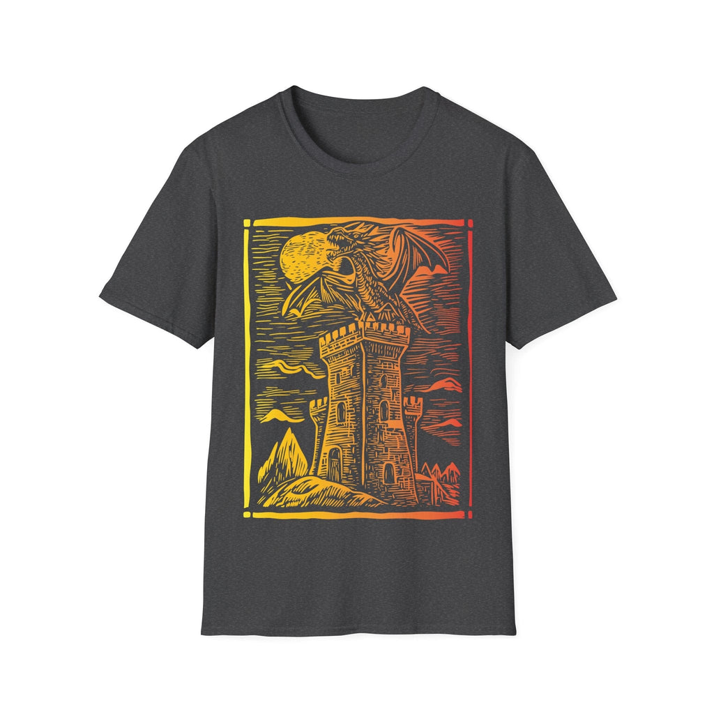 Bring the heat with this striking dragon t-shirt, featuring a bold woodcut-style design of a fearsome wyrm perched atop a towering fortress under a full moon. With fiery sunset tones fading from yellow to deep red, this tee captures the epic energy of high fantasy in a dramatic and wearable piece of art. Whether you're a dungeon master, a dragonborn enthusiast, or just someone who respects a majestic apex predator with a real estate portfolio, this shirt is ready for your next quest—on or off the battlefield.