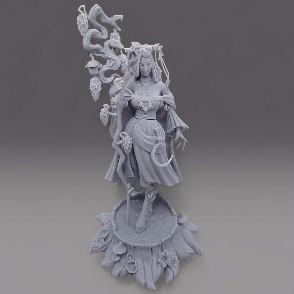 Fearne from Critical Role brought to life in this 1:8 scale collectible. The faun warlock stands on a tree stump with a snake-wrapped staff, wearing a flowered dress and sickle at her hip. Also includes a bust version, ideal for fans of Vox Machina and D&D decor.