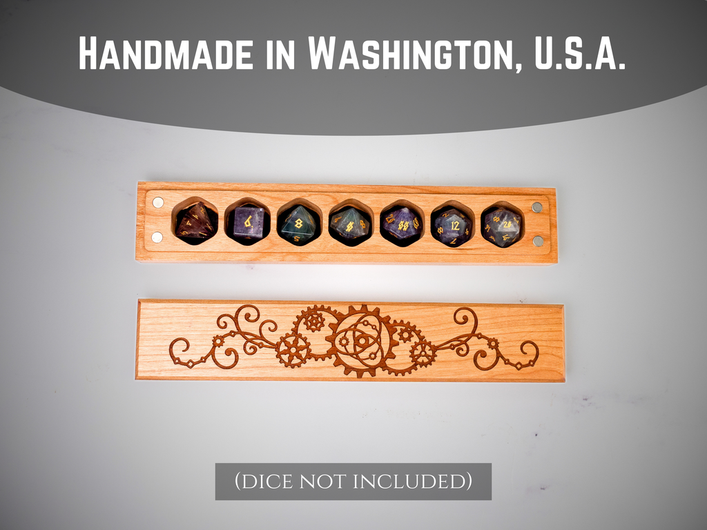 The Council of 7 design perfectly accommodates a full set of RPG dice (d4, d6, d8, d10, d12, d20, and percentile), keeping them organized and protected between adventures. The detailed gear lock engravings showcase mechanical imagery that resonates with artificers, inventors, and players who appreciate steampunk themes. Crafted from quality wood with meticulous attention to detail, this vault combines practical functionality with inspiring industrial artistry.