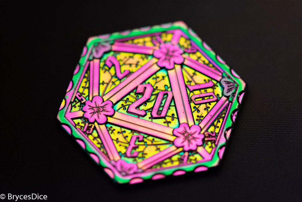 Rainbow d2 Coin Shaped like d20 w/ Purple/Yellow Tint (V2)