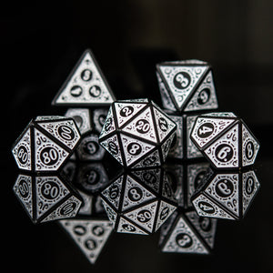 Each die is hand carved from pure gemstone and polished in a proper tumbler. Designs are then engraved into each side and hand painted. Gemstone dice are never guaranteed to have a perfectly balanced weight; however, each of our dice sets are always well weighted and well balanced.