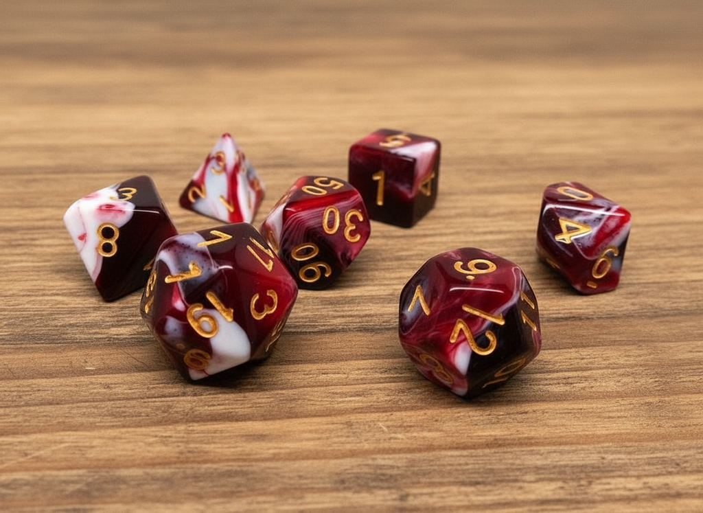 Dice Collection has a blend of red and dark reds with white swirls. Each set features gold numbering.