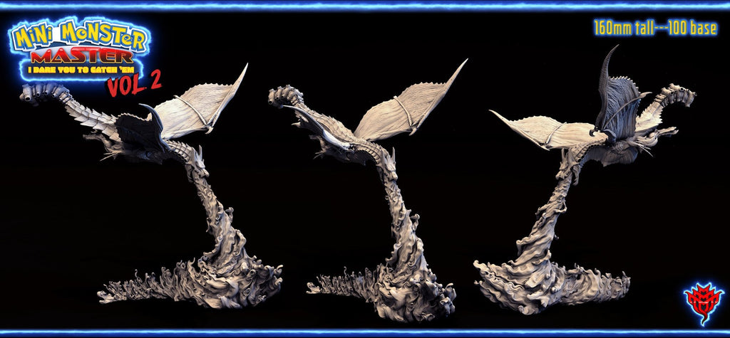 The Colossal Inferno Drake, a powerful dragon miniature inspired by Charizard, features detailed scales, a fierce expression, and massive wings poised for flight. Perfect for fantasy tabletop games and painting enthusiasts seeking a dynamic centerpiece.