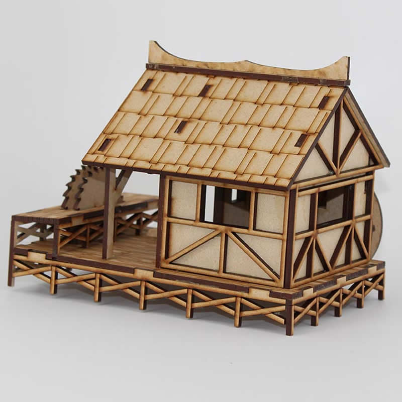 Down by the riverside sits the local Sawmill. This large structure features an enclosed living quarters with removable roof, porch, saw, water wheel, and raised construction to keep it out of the water. Designed for 28mm miniatures. Made of sturdy 3mm MDF board. Kits ship unassembled and unpainted. Approximately 4 inches tall when completed.