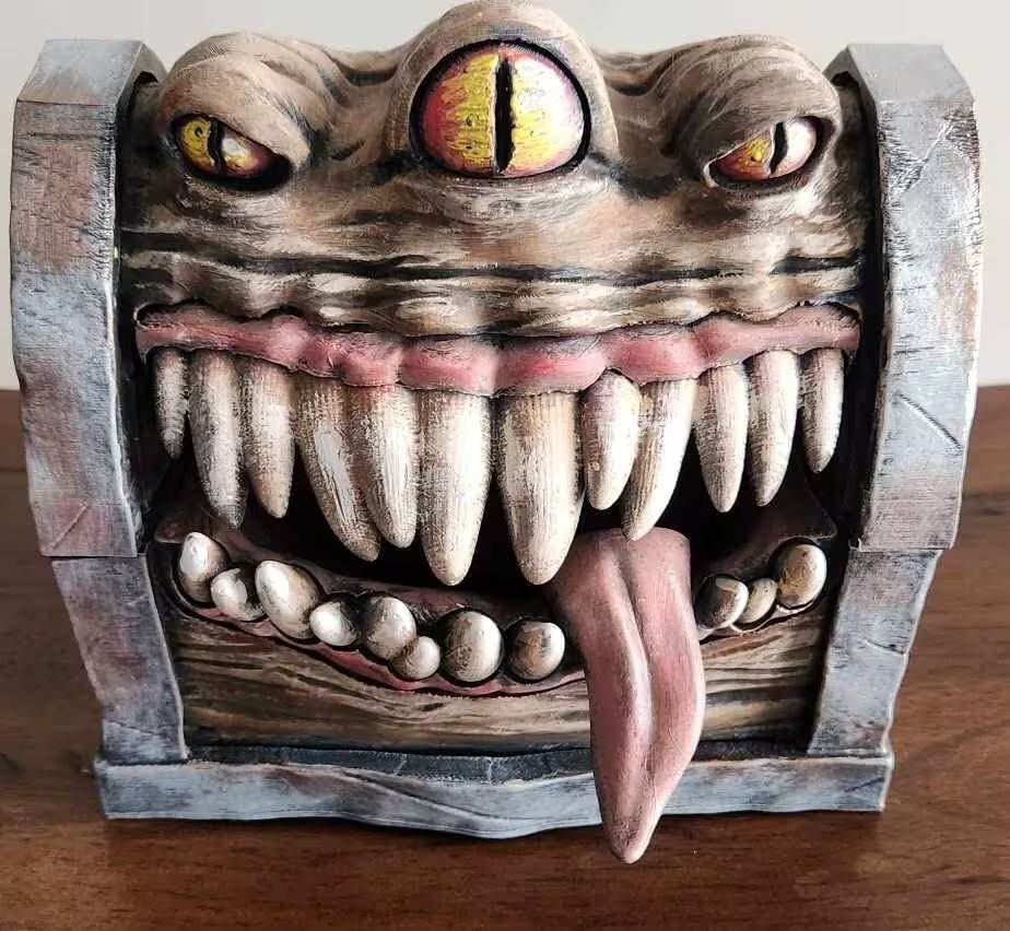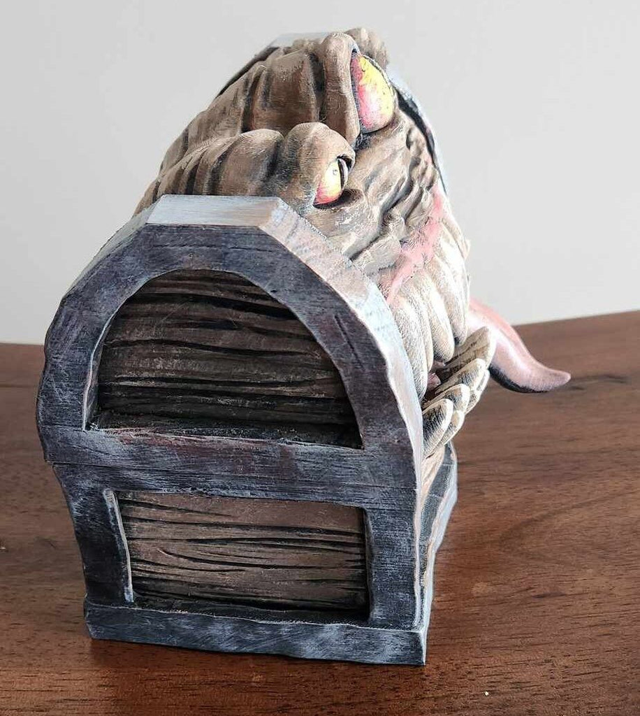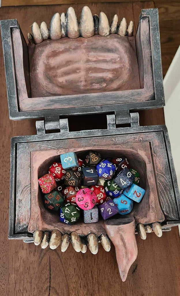 The Mimic Dice Vault is a cunningly designed storage solution that looks like a monstrous mimic. It opens with a menacing grin to reveal a secure compartment for your dice, adding a touch of adventure to any tabletop RPG session. Perfect for D&D and other role-playing games.