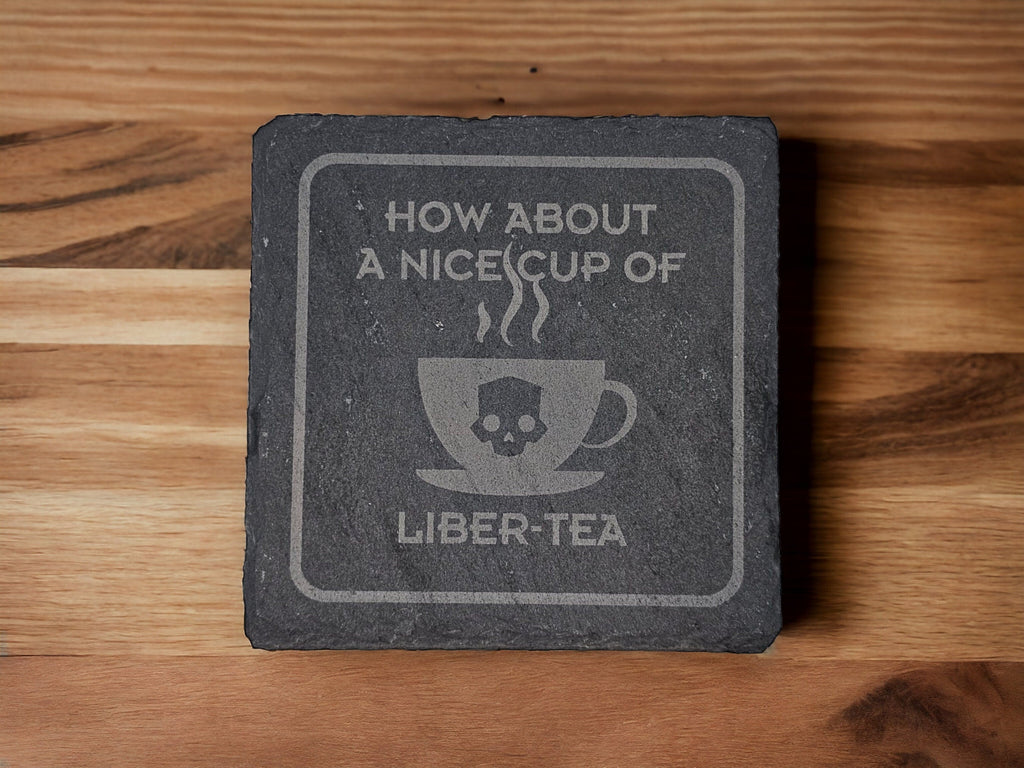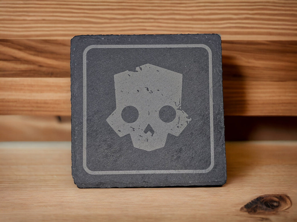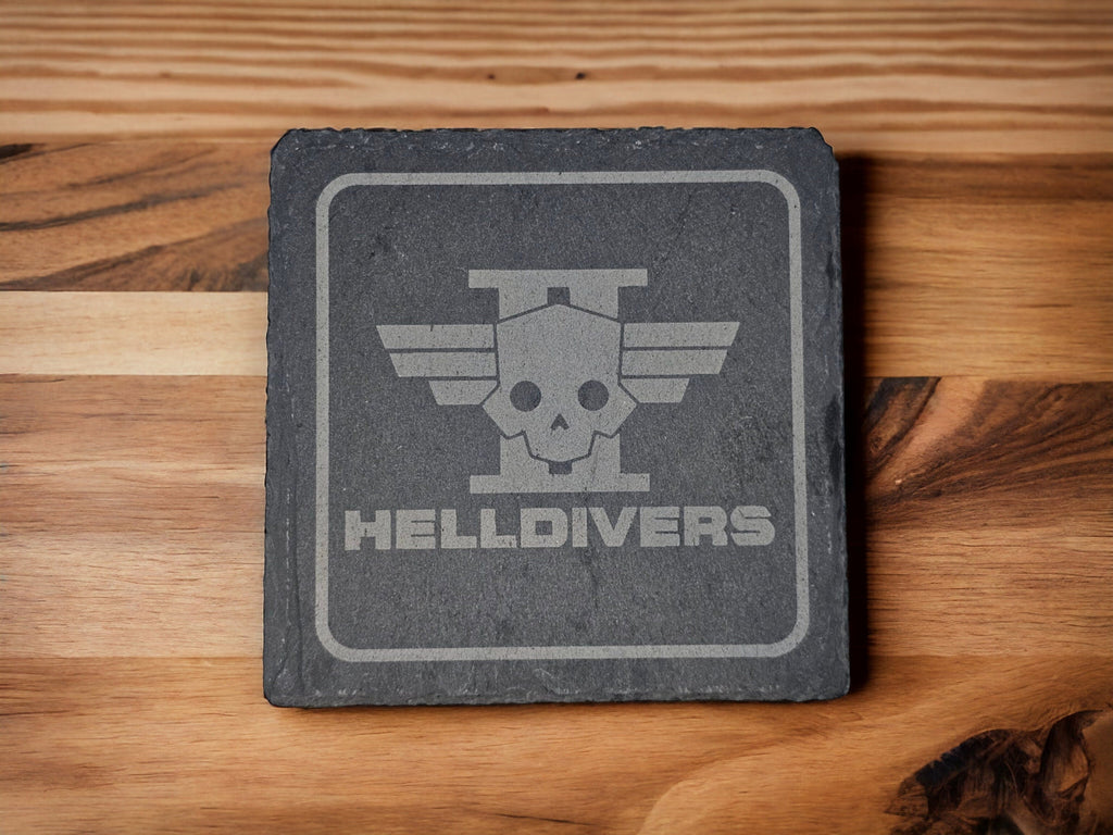Drop hot and drink harder. This 5-piece engraved slate coaster set features classic Helldivers icons — one for every soldier in your squad (or just one for every drink you spill in style).