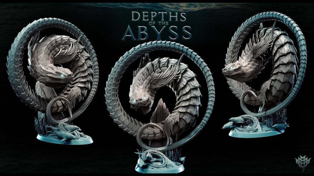 A Sea Serpent coils through the ocean's depths with sinuous grace. This colossal, aquatic creature boasts shimmering, scaled skin that glistens in shades of deep blue and emerald. Its long, serpentine body is adorned with fin-like appendages that aid in swift, fluid movement through water. With a fearsome maw full of razor-sharp teeth and eyes that gleam with ancient intelligence, it is a formidable predator. This Sea Serpent is an ideal adversary for D&D, Pathfinder, or other fantasy RPGs, offering a challenge to any adventurers brave enough to face it.