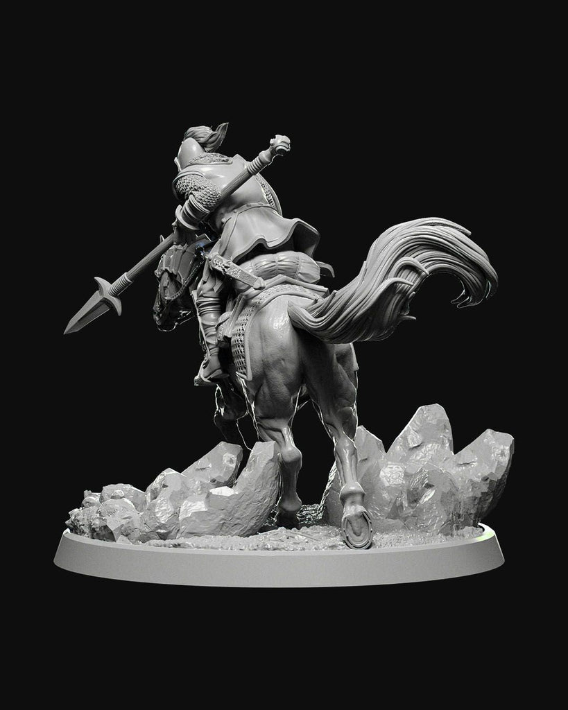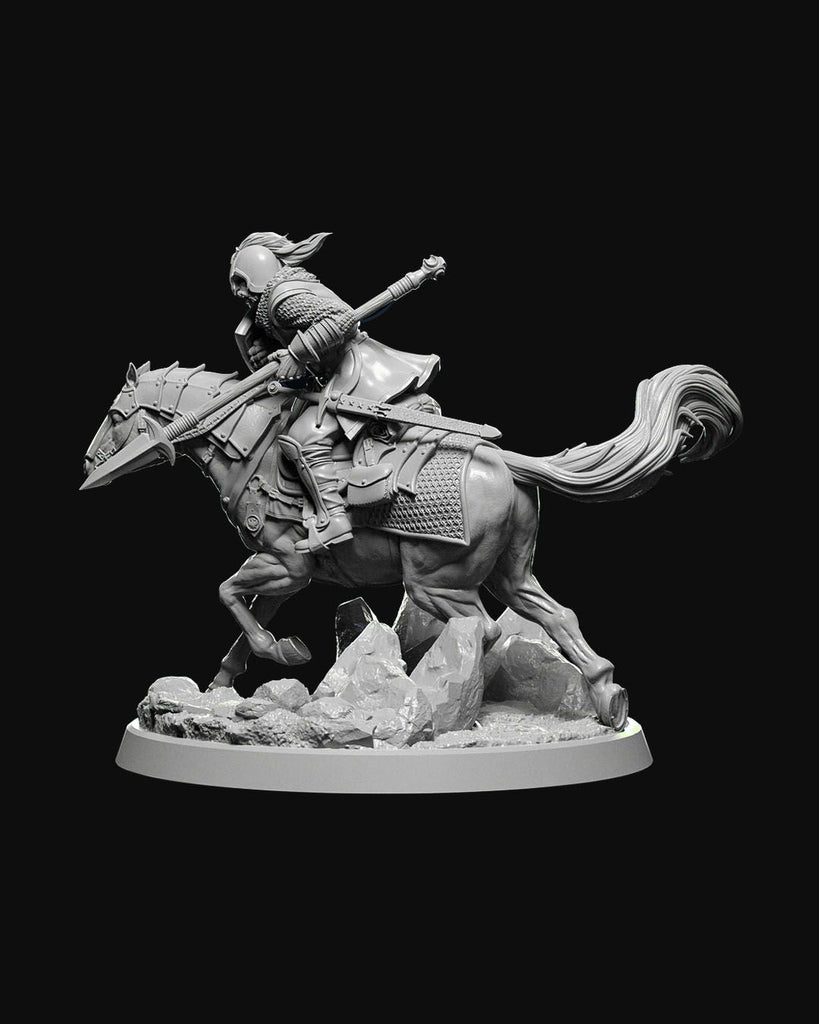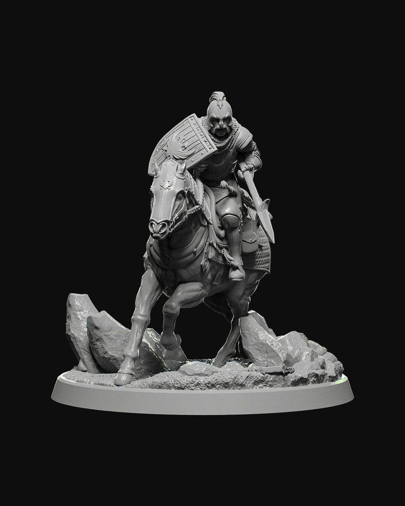 Town Cavalry miniature, featuring an armored rider on a warhorse charging forward with a lance, expertly crafted for tabletop RPGs like D&D and Pathfinder. Ideal for adding a dynamic and powerful figure to your collection or game board.