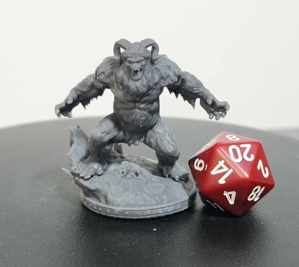 A pair of savage Yetis stand poised for battle, each displaying a fearsome stance. Their fur bristles as they prepare to attack, surrounded by a rugged landscape of rocks and bones. These miniatures are ideal for creating a terrifying encounter in D&D or Pathfinder games.