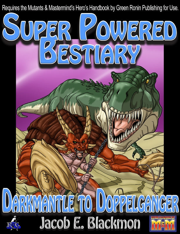 Volume Two of the Super Powered Bestiary provides more than 30 full creature write-ups for the 3rd Ed M&M rules, including a broad selection of Dinosaurs, Demons, and Devils! Obviously of great us to anyone running a fantasy-themed game with this ruleset, the Super Power Bestiary also provides options for more traditional supers and masked adventurer games! Whenever a GM wants the heroes have to face a T-Rex on Jurassic Island, survive the Infernal Guard of Doctor Devil, or overcome Dimensional Demons summoned by the evil Tyrant Sorcerer, the threats can quickly and easily be drawn from this first volume of the Super Powered Bestiary!