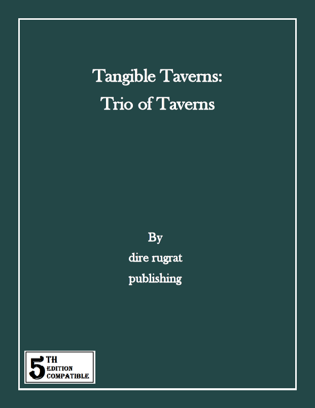 Tangible Taverns: Trio of Taverns brings you three smaller scale taverns each with rumour and event tables, a tavern map, and a description of frequent faces about the establishment (which include names, physical features and personalities for some tavern employees and patrons).