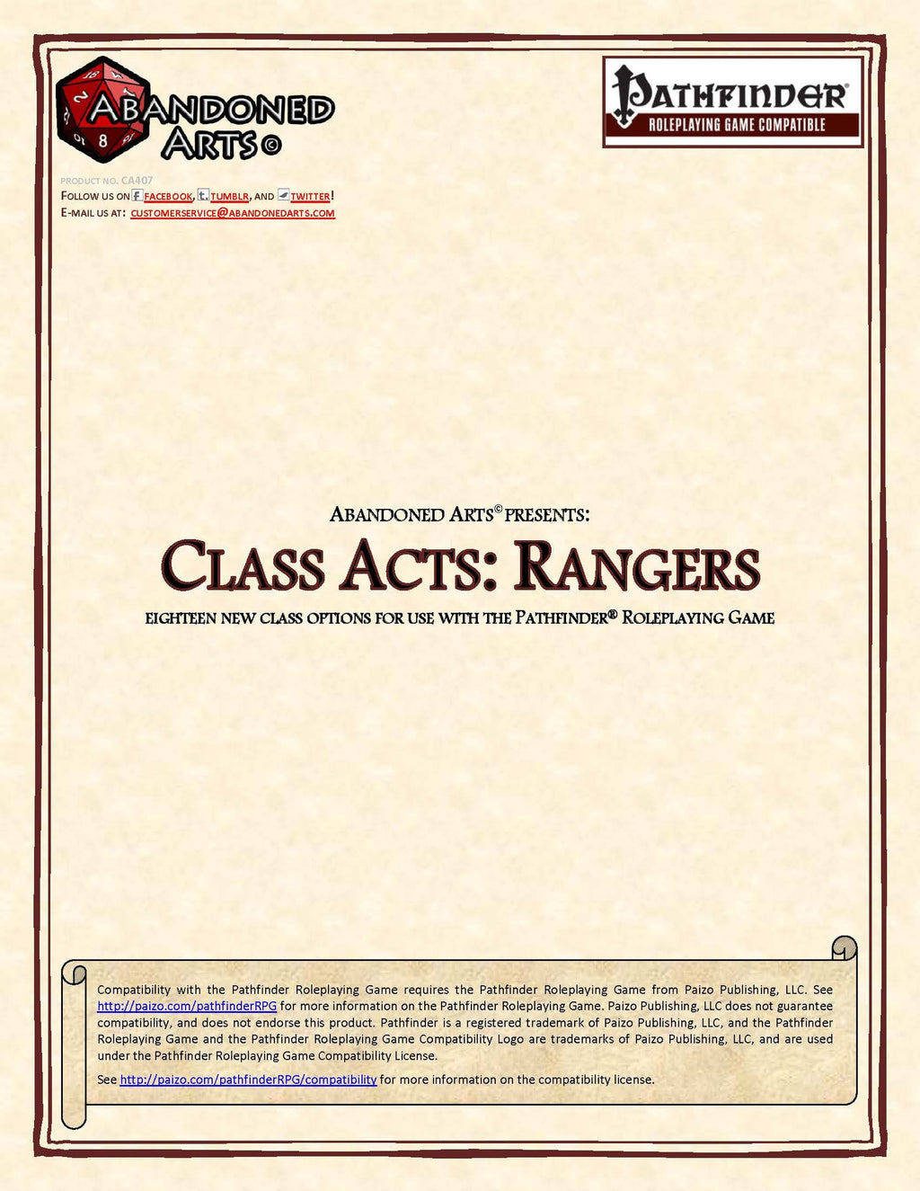 Class Acts: Rangers includes eighteen new character options for rangersfifteen feats designed with the ranger in mind, and three brand new combat styles: the Beast Tamer, Firearm, and Guerilla Warfare styles.