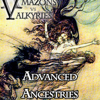 With this supplement, players in the Amazons vs Valkyries Campaign Setting may choose from eight non-human ancestries. Your character may be a lumbering giant kin from Jotunheim, or a wild faun obsessed with partying and celebration. She may be a revolting dwarf-like thing with a twisted sense of humor, or she may be an angelic warrior with an allegiance to the Vanir.