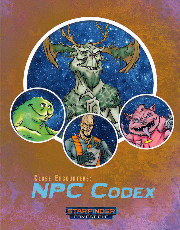 Close Encounters: NPC Codex is a book intended to give GMs a wide range of prebuilt NPC characters to use on the fly, as they see fit. Inside you’ll find a host of 13 different NPCs (3 combatants, 3 experts, 2 spellcasters, and 5 custom), with each entry represented over ten different Challenge Ratings 1 - 19; that’s 130 new NPC entries! These NPCs include the seven Core Races, sentient swarms, transforming robots, and a new Wild Wyrm dragon template. Each NPC has a full stat block, all the in-game information you need to run the character, and a brief paragraph about how they fit into the galaxy around them. Whether you need a lowly CR 1 Vid-Star Host, or a CR 19 Cyborg Skittermander, Close Encounters: NPC Codex has something for you!