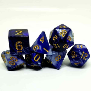Marbled dark blue and light blue plastic dice with gold numbering. Perfect for all of your tabletop RPG needs (D&D, Dungeons & Dragons, Pathfinder, etc.).