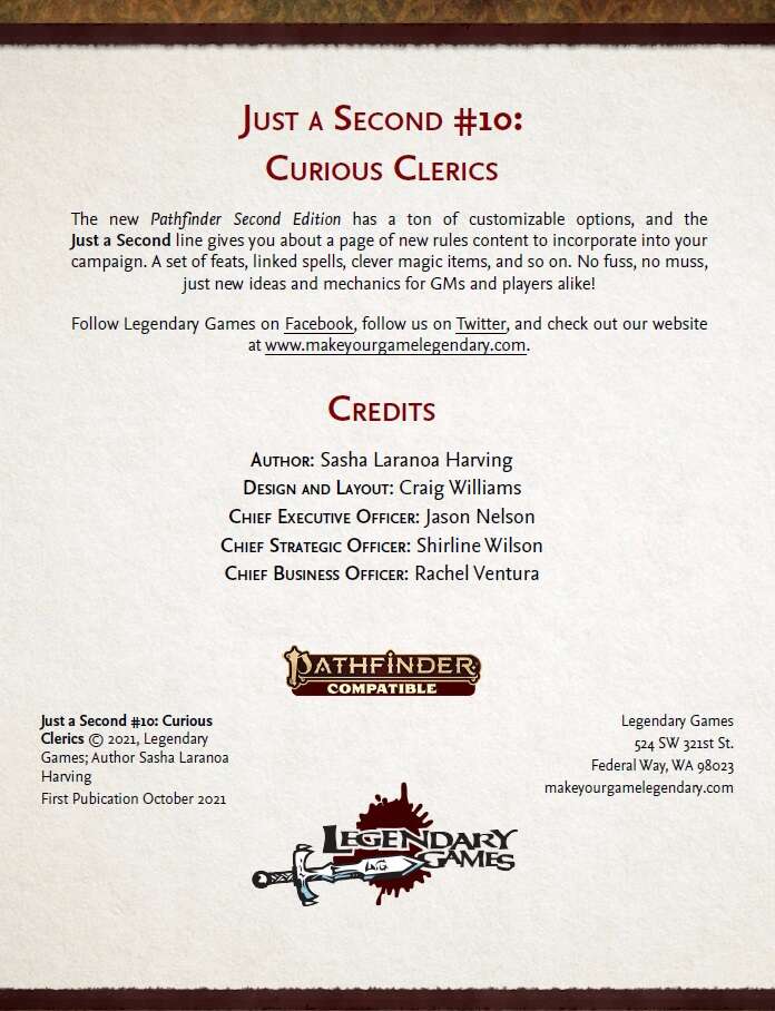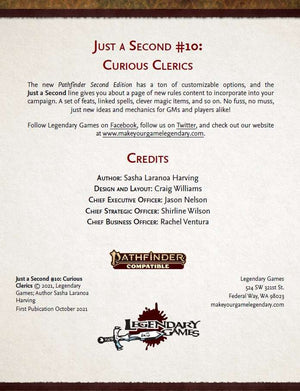 The new Pathfinder Second Edition has a ton of customizable options, and the Just a Second line gives you about a page of new rules content to incorporate into your campaign. A set of feats, linked spells, clever magic items, and so on. No fuss, no muss, just new ideas and mechanics for GMs and players alike! Grab the latest Just a Second today and Make Your Game Legendary!