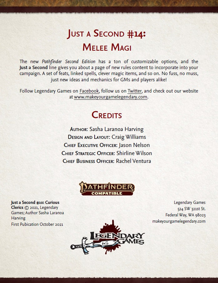 The new Pathfinder Second Edition has a ton of customizable options, and the Just a Second line gives you about a page of new rules content to incorporate into your campaign. A set of feats, linked spells, clever magic items, and so on. No fuss, no muss, just new ideas and mechanics for GMs and players alike! Grab the latest Just a Second today and Make Your Game Legendary!