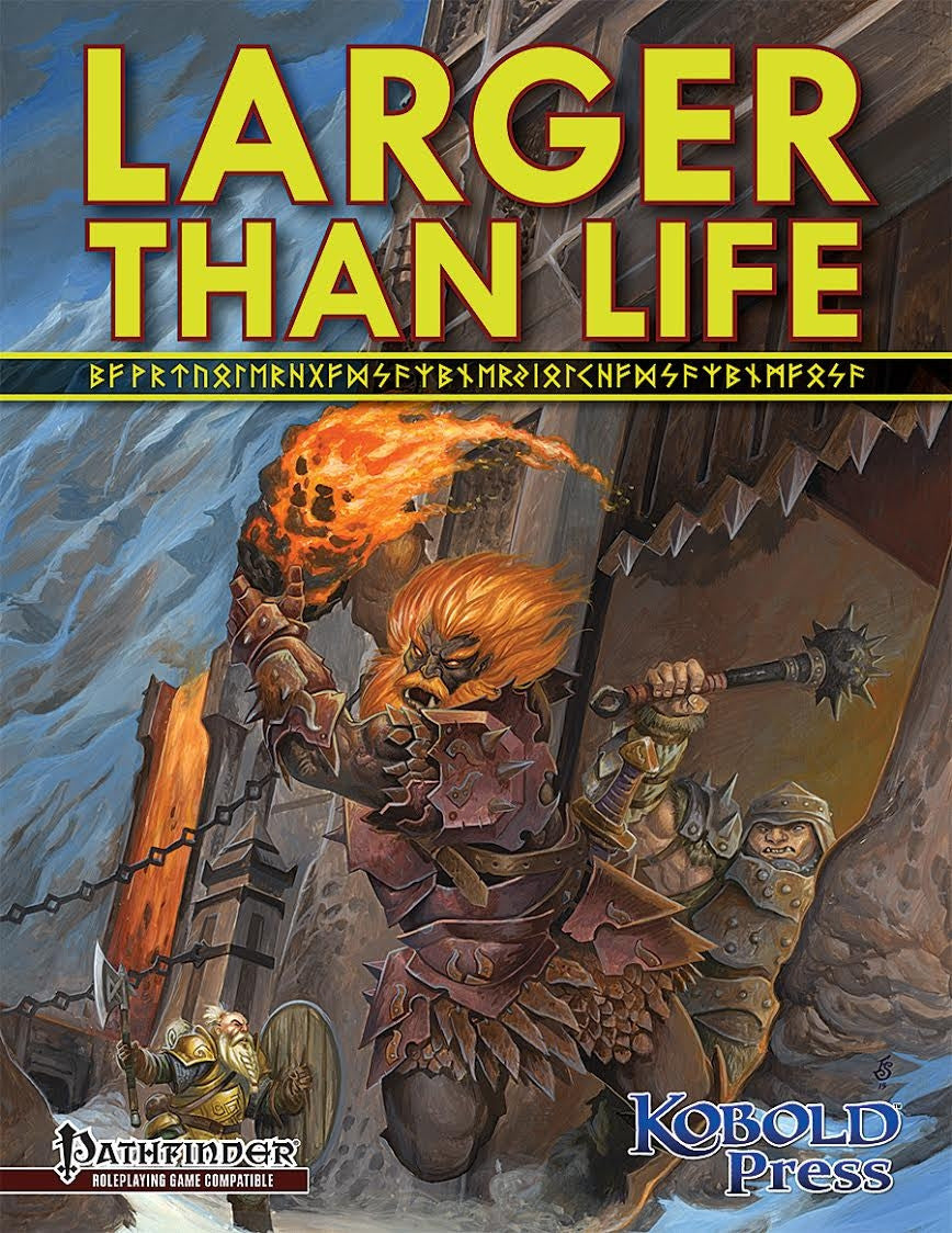 Larger Than Life: Giants for the Pathfinder Roleplaying Game gives you everything you need to bring these terrifying titans to your table. This 76-page book by RPG Superstar Mike Welham offers Thursir, Hill, Frost, Stone, Fire, Cloud, and Storm Giant NPCs—plus new spells, feats, and gear to strike terror into the hearts of puny adventurers.