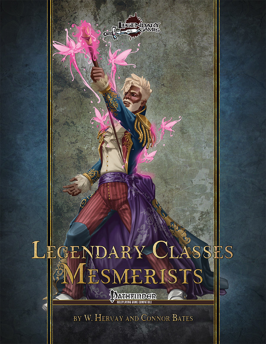Legendary Mesmerists is the latest volume in our series of class expansions for Pathfinder RPG, focusing on the premiere manipulators and mind-warpers. Their harsh, piercing gaze is but one conduit for the occult potential of the Astral Plane, leading hapless victims on puppet strings with the wave of a hand and aweing friend and foe alike with sheer presence alone, leaving the world trembling under the weight of naught but words. Mesmerists spread their influence far and wide with tools from terror to madness, alongside impeccable fashion sense and elan. Sixteen spectacular hypnotic foci form the core of the Legendary Mesmerist, setting the tone for their mental mastery from fear and pain to magnificence and supremacy, or mastering hand, tool, or voice as the conduit of their power. Each focus shapes their spell list and class features along a theme, so each Legendary Mesmerist plays very differently. Add to this an awesome array of alternate rules for both this new version of the class and the core Pathfinder mesmerist, including the Astral Host, Sympathetic Mesmerist, and Worldbraver archetypes, 14 fabulous feats like Passionate Focus, Fashion Dictator, and Rule the Rabble, as well as three dozen spells from prison of eyes and malice funnel to day of dreams and peerless propaganda! The Legendary Mesmerist is a dedicated spellcaster who will unleash a whole new level of mental mastery to your campaign.